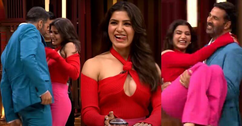 Samantha wears a pink and red outfit while Akshay wore a blue suit. As they take the couch, Karan mentions how Samantha and Akshay are the leading, most successful actors in India. Samantha said that she did not mind being carried in by Akshay.